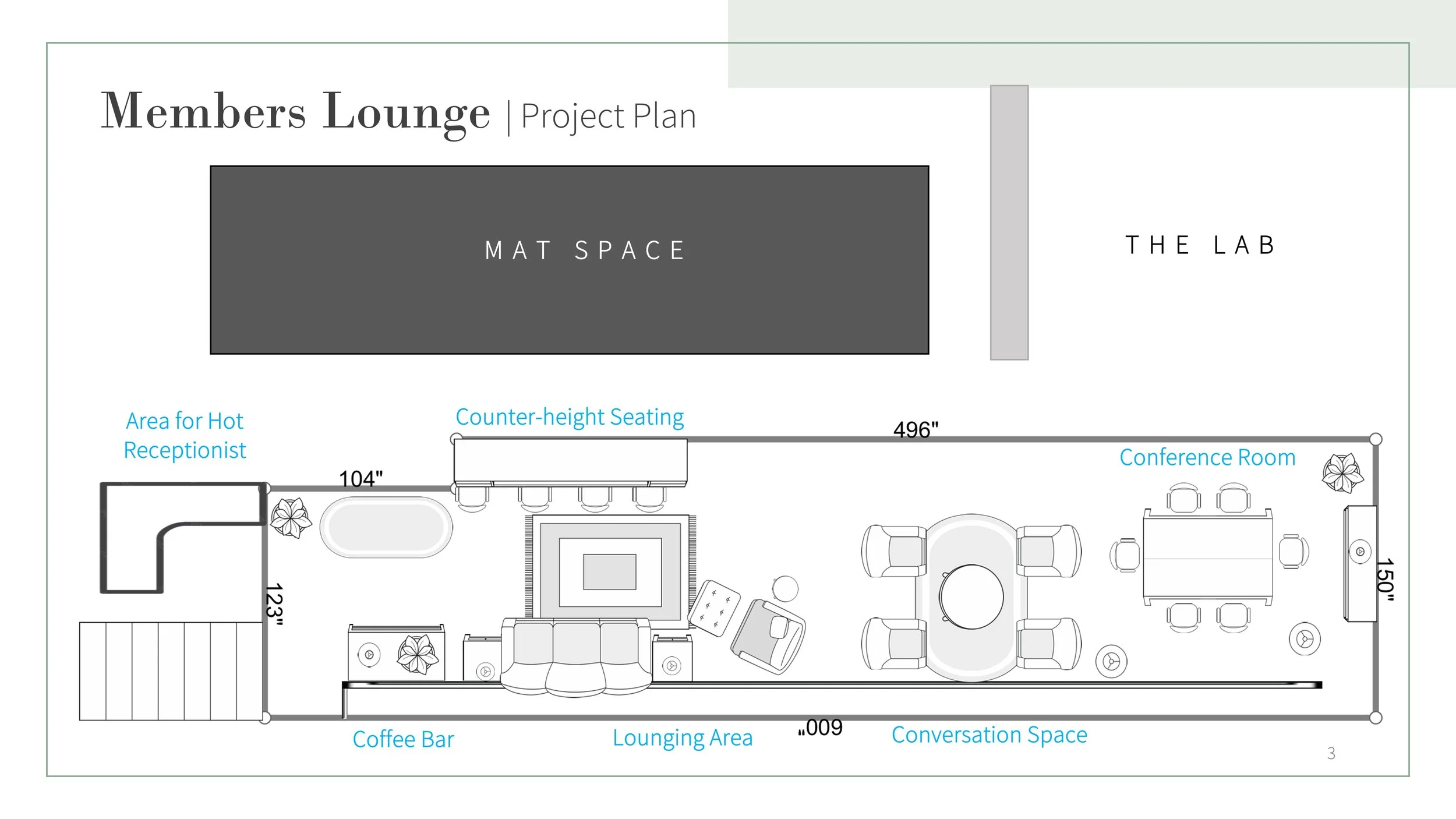 The Members Lounge has been a long time coming. Like most projects at LŌKAHI, the vision was the easy part. Coordinating contractors, picking furniture, and agreeing on colors proved to be much more challenging. Take a peak at the initial layout from our project plan.